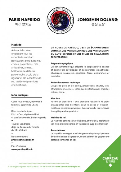 - Éric Le Cam dirigera les cours de Hapkido du vendredi de 19h à 20h45